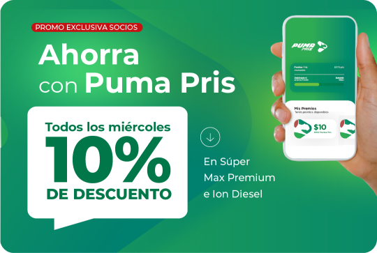 10% de descuento en la compra de Super, Max Premium e Ion Diesel pagando con Puma Pris en Estaciones Adheridas. Tope de reintegro: Hasta 50 litros por miércoles.